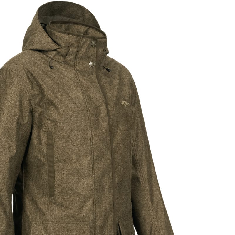 2 rétegű, vízálló és szélálló kabát Blaser Vintage anyagból, 133 g bélés a kabát törzsén és 80 g az ujjakban, megemelt kézmelegítő zsebek bolyhozott béléssel, 2 alsó, hajtókás zseb 1 patenttal és taft béléssel a nagyobb tartósság érdekében, levehető és kétpontosan állítható kapucni, velúr részletek a galléron és a zsebfedőkön, állítható alsó szegély a szoros illeszkedés érdekében, a belső bélés polárból a hát felső részén, taft bélés a kabát többi részén, Blaser Arcantus díszes nyakcímke és ujjjelvény.