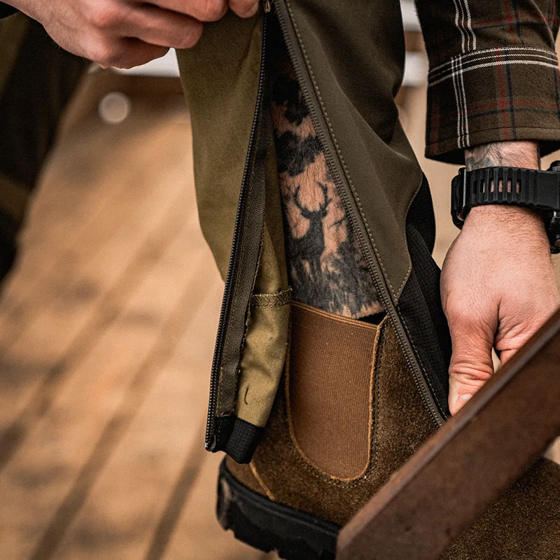 A Hemlock nadrág újrahasznosított poliészterből és organikus pamutból készült, extra hosszú szellőző cipzárral, rugalmas betétekkel és tartós kialakítással – fenntartható választás aktív vadászok számára.