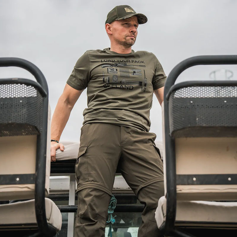 A Seeland Packing T-shirt minden vadász ruhatárának alapdarabja. Mellkasán kreatív grafika jeleníti meg a sikeres vadászathoz szükséges alapfelszerelést, amely stílusos megjelenést kölcsönöz a pólónak. Puha, 100% pamut anyagának köszönhetően kényelmes viseletet nyújt, akár a szabadban, akár hétköznapi használat közben. Kerek nyakkivágású, klasszikus szabású kialakítása miatt sokoldalúan kombinálható és könnyen illeszkedik bármilyen öltözékhez.